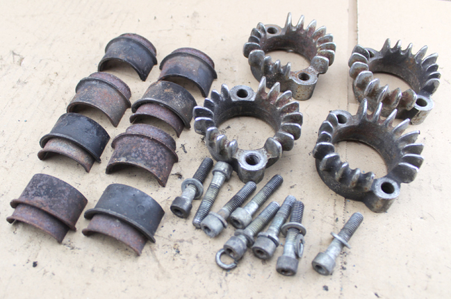 Set of clamps/cooling rings with half shells and matching Allen screws – complete for flanging the manifold to the engine – for CB 750 Four F1+F2+K7. Technically ok, but rusty.